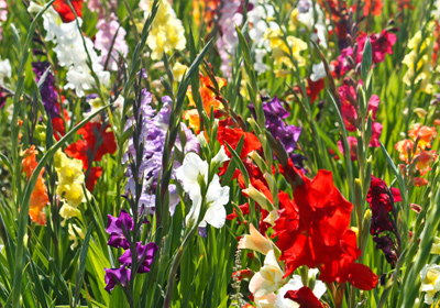 Gladiolen eignen sich nicht nur hervorragend als Schnittblume, auch im Garten fallen sie mit ihrer tollen Blütenpracht auf. Gladiolen gehören der Familie der Schwertlilien an und kommen ursprünglich aus Südafrika. Eine eifrige Zucht in den letzten 200 Jahren führt zu einer großen Sortenvielfalt mit über 250 Arten und Blüten in allen möglichen Farben. Ob Weiß, Gelb, Rot, Rosa, Violett, oder zweifarbig, der Auswahl sind keine Grenzen gesetzt. Eine großzügig mit Gladiolen bepflanzte Fläche wirkt auffallend schön, gern kann man auch viele verschieden Farben einfach nebeneinander setzen und erreicht somit ein buntes Farbfeld.